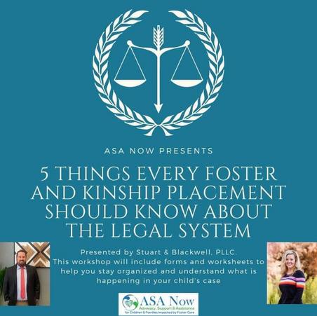Join ASA Now and Stuart & Blackwell, PLLC for this workshop as we present the 5 things every foster and kinship placement should know about the legal system, including providing forms and worksheets to help you stay organized and understand what is happening in your child’s case.